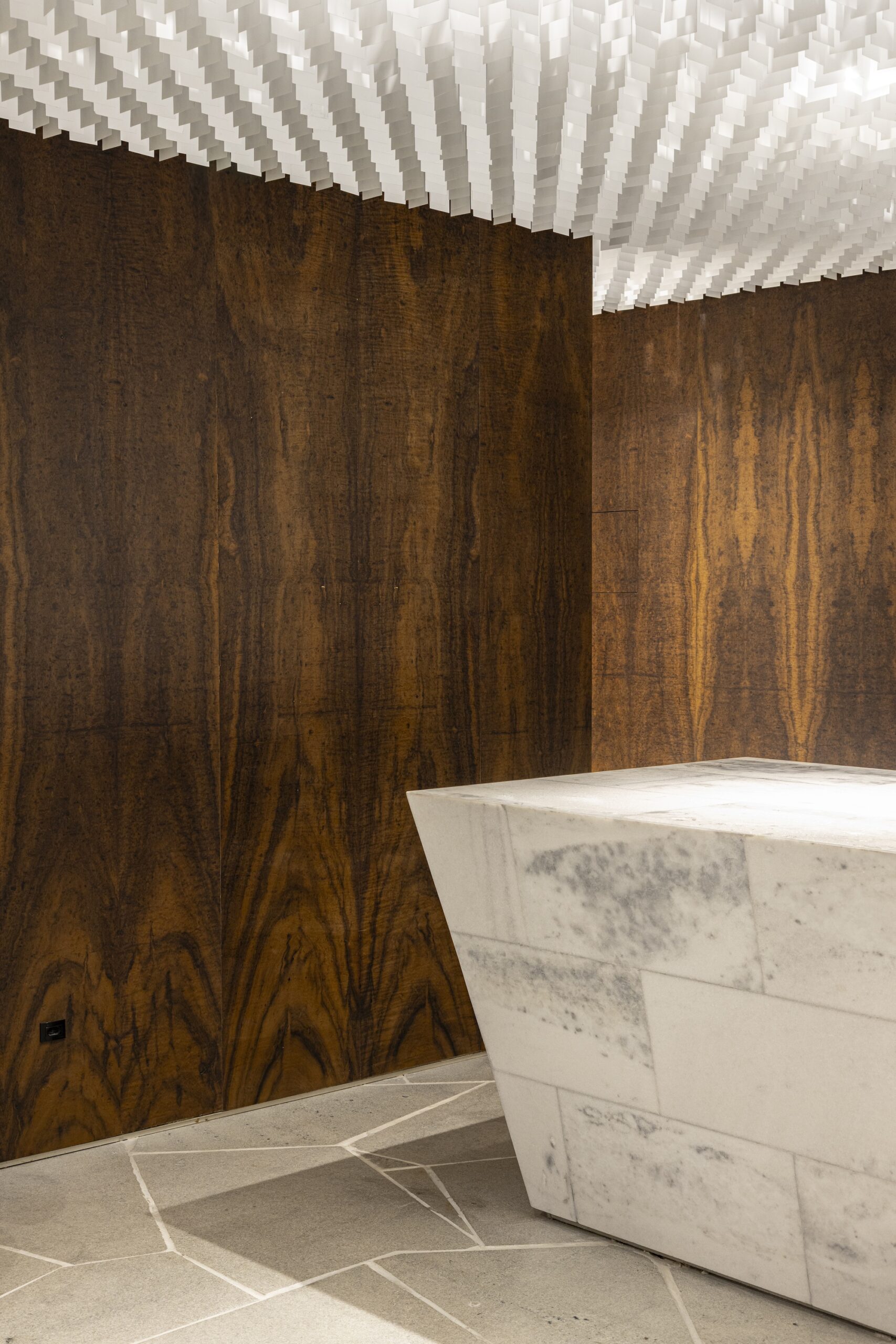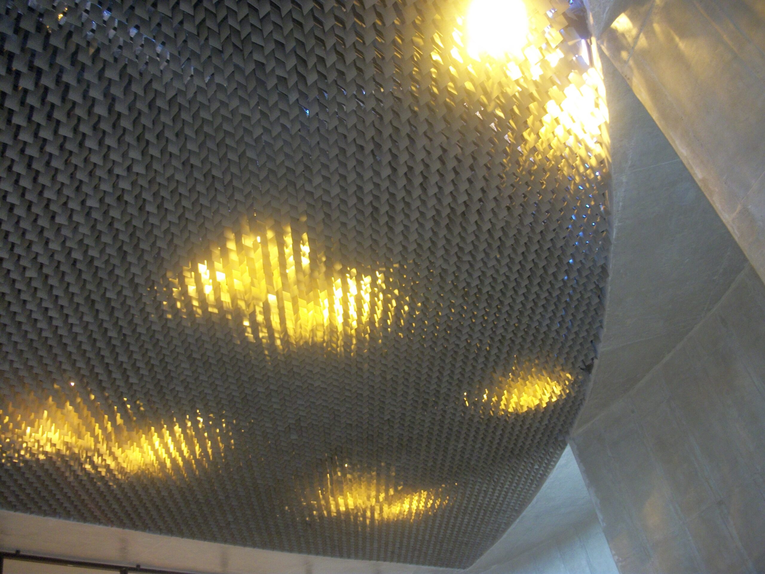 Es un falso techo decorativo y abierto, compuesto por placas colgadas de forma alternada a través de una estructura oculta, lo que permite un mayor movimiento visual. Como las rejillas quedan simplemente apoyadas, su remoción es sencilla, permitiendo el acceso a las instalaciones del techo.